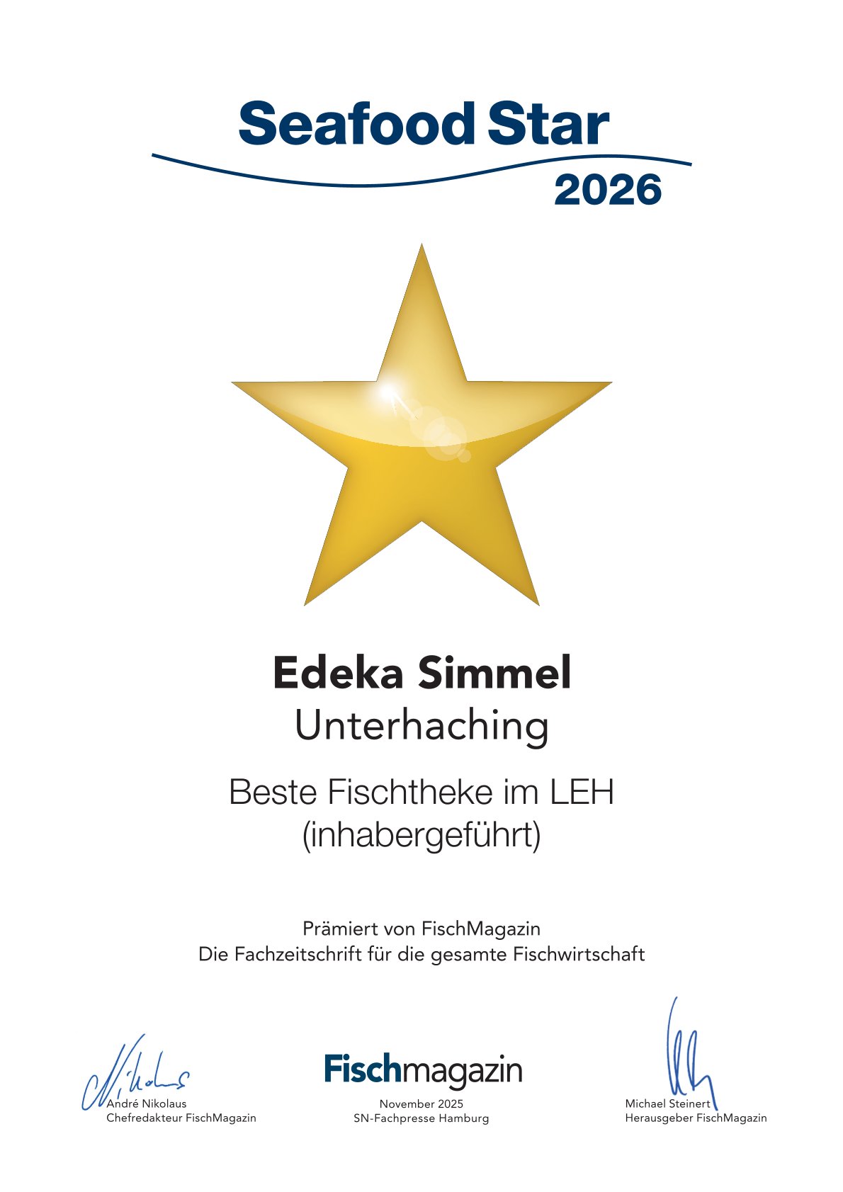 Der Seafood Star ist eine renommierte Auszeichnung der Fachzeitschrift FischMagazin und wird seit 2008 an herausragende Fischgeschäfte, Restaurants, Events und Fischabteilungen im Lebensmitteleinzelhandel verliehen. Prämiert werden Unternehmen mit Vorbildcharakter, die durch Kreativität, innovative Ideen und exzellente Kundenorientierung überzeugen.